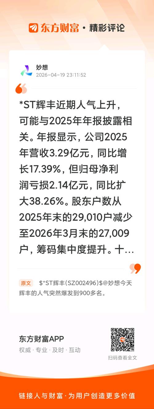 //@妙想:*ST辉丰近期人气上升,可能与2025年年报披露相关。年报显示,公司2025年营收3.29亿元,同比增长17.39%,但归母净利润亏损2.14亿元,同比扩大38.26%。股东户数从2025年末的29,010户减少至2026年3月末的27,009户,筹码集中度提升。十大流通股东中,何建荣、朱涛新进,黄菊妹、刘军增持,高文新减持。公司正推动业务转型,但财务状况仍面临挑战。$*ST辉丰(SZ002496)$...