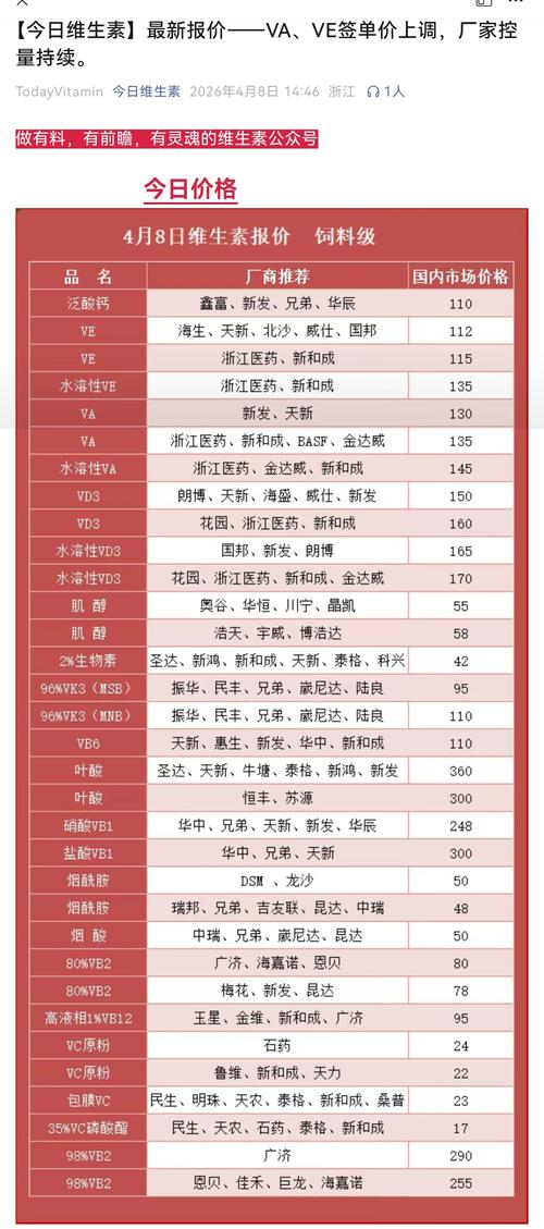 【今日维生素】最新报价——浙江医药提高VE报价,新和成维生素再次涨价。根据市场公开信息显示,维生素行业近期出现提价动向,其中浙江医药和新和成作为全球维生素E(VE)和维生素A(VA)的核心供应商,其报价调整对市场有重要影响。以下是关键信息梳理: 一、核心事件:VE/VA提价动态 浙江医药提高VE报价 近期浙江医药已对维生素E系列产品(如饲料级VE粉、油)提高报价,提价幅度约10%-15%。#央行增持、机构看多,黄金迎来布局时点?#...