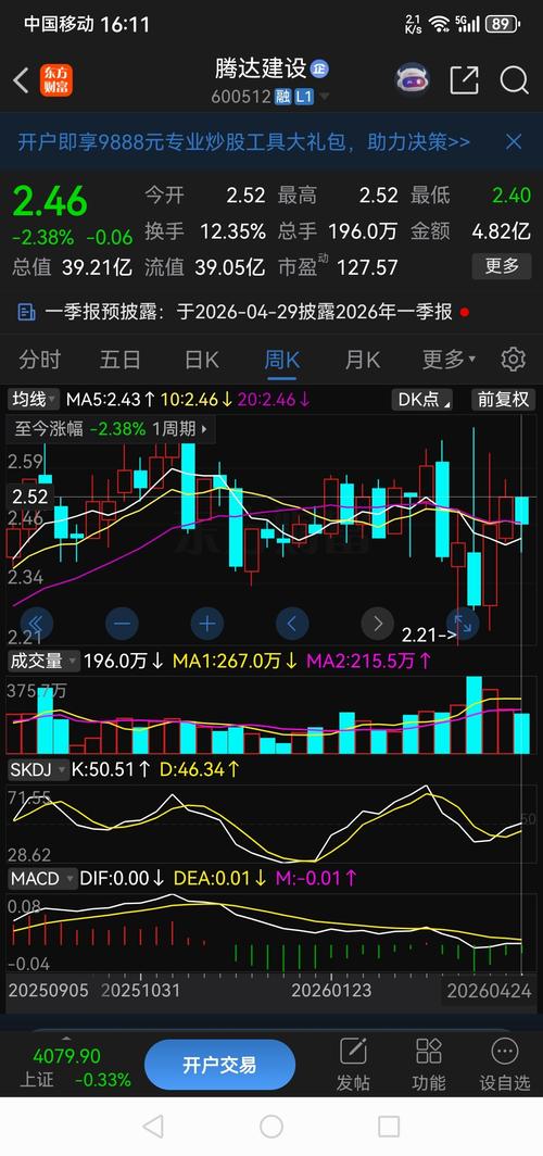 $腾达建设(SH600512)$ 近期窄幅震荡走势。