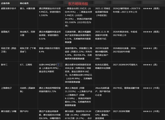 - 东方明珠(600637)参股企业精简一页摘要(2026.04.25 核验) 一、核心战略平台(直接持股) 上海信投:21.33%,核心科创母平台,直通硬核科技资产 上海垣信卫星:直接4%+间接4.39%,合计8.39%,低轨卫星互联网 文广财务公司:40%,集团资金与投融资协同 二、直接参股上市公司 兆驰股份:6.32%(MiniLED/光通信) 老凤祥:2.44%(消费珠宝) 歌华有线:1.46%(广电网络) 中国电信:约0.25%(算力基建) 腾讯控股(港股):海外平台长期财务投资 三、重点间接参股硬核科技(精准比例) 上海微电子:约1.73%(国产光刻机) 超聚变:约1.32%(国产服务器,IPO中) 摩尔线程:约0.099%(国产CPU) 沐曦集成:约0.0007%(国产GPU) 新华三:战略间接参股(云计算/网络设备) 蓝箭航天、月之暗面:产业基金间接布局(商业航天) 四、核心合资/联营 上海百家合(微软合资)、东方电视购物、东方绿舟、文广科技等 五、核心逻辑小结 主业稳固(传媒+文旅+广电),以上海信投为抓手,深度卡位光刻机、算力服务器、国产芯片、卫星互联网、商业航天五大硬科技赛道,搭配优质蓝筹财务投资,兼具稳健现金流与科创估值弹性。