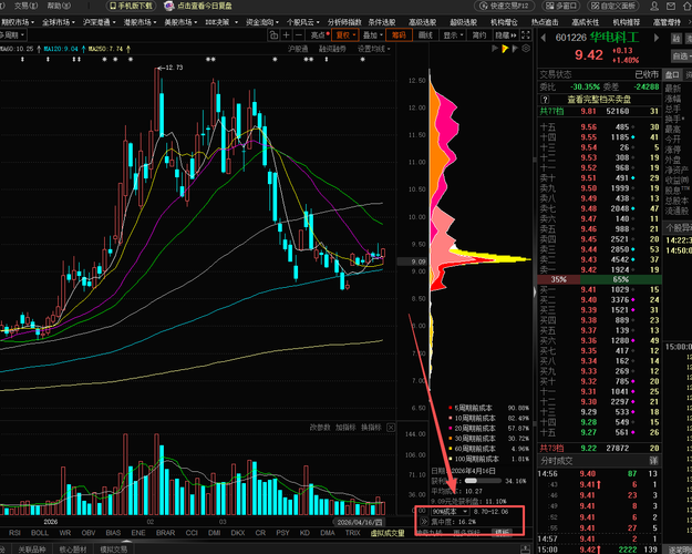 对后市简评:华电将如何选择方向? 结合多方因素,在跌破9元后不断出利好堆积,反身向上站稳9元已经3天。并且5日线勾头上穿10日线,今天考验30日线9.35元。如果站上30日线,短期有走强迹象。将会在9.20到10.06元区间震荡。 个人判断:短期不会跌破9元,如果破9就会去补缺口,根据盘面情况看。今天打算在9.25左右再次介入底仓,观察后市走强可能。