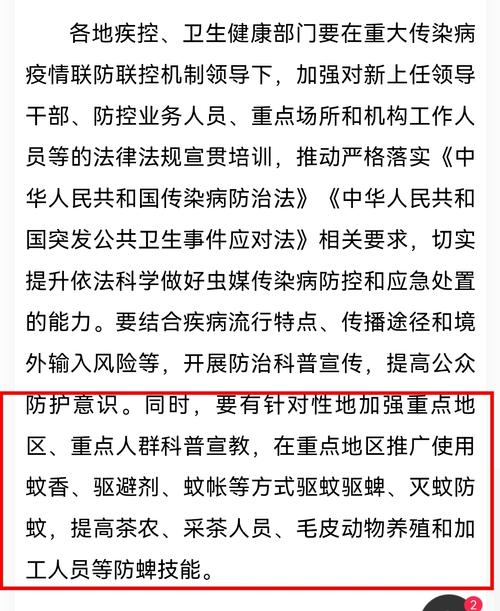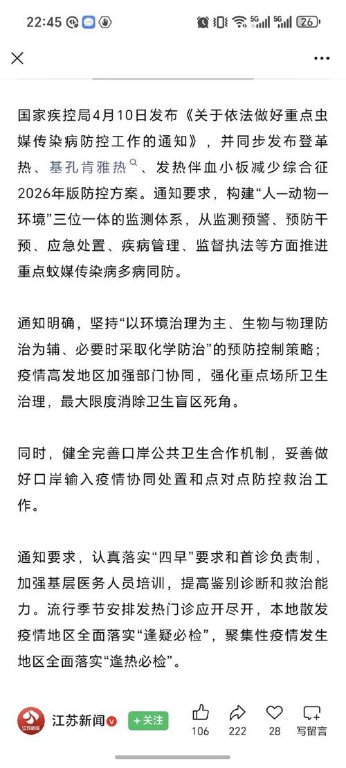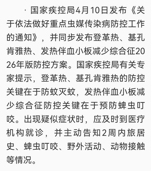 42- 2026年4月10日,国家疾控局发布《关于依法做好重点虫媒传染病防控工作的通知》。 《通知》要求,构建“人—动物—环境”三位一体的监测体系,从监测预警、预防干预、应急处置、疾病管理、监督执法等方面推进重点蚊媒传染病多病同防。 《通知》明确,坚持“以环境治理为主、生物与物理防治为辅、必要时采取化学防治”的预防控制策略;疫情高发地区加强部门协同,强化重点场所卫生治理,最大限度消除卫生盲区死角。 同时,健全完善口岸公共卫生合作机制,妥善做好口岸输入疫情协同处置和点对点防控救治工作。 《通知》要求,认真落实“四早”要求和首诊负责制,加强基层医务人员培训,提高鉴别诊断和救治能力。流行季节安排发热门诊应开尽开,本地散发疫情地区全面落实“逢疑必检”,聚集性疫情发生地区全面落实“逢热必检”。