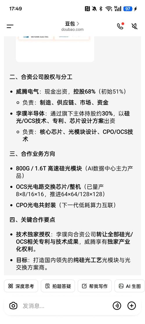 【问】孛璞半导体发布澄清声明,从未对任何第三方公司进行光电路交换(OCS)技术的全权授权,亦从未将OCS技术的完整知识产权对外转让或独占许可。该澄清公告致使股价大跌。孛璞辟谣了技术授权或专利转让。请问:1.成立合资公司威璞光电与孛璞的合作是否继续推进。如果继续推进,目前是什么进度?2.孛璞是否已经按照贵司的公告转让已有的硅光高速光模块技术方案,并组件了技术团队。3.硅光模块是否已经送样。【答】威腾电气:尊敬的投资者您好,江苏威璞光电业务为基于硅光技术和工艺的高速光模块/组等光通信相关产品,暂未涉及OCS相关业务。目前公司业务正常开展,后续将根据业务进展及时进行信息披露。合作单位相关信息以合作方公开信息为准。公司光电业务尚在早期发展阶段,未来发展存在不确定性,敬请投资者充分关注相关风险。感谢您的关注。