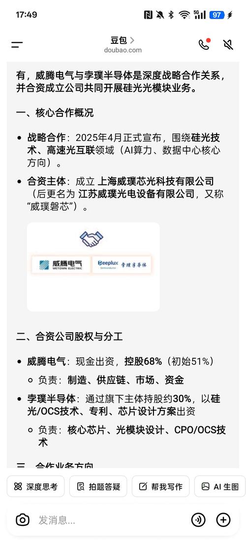 威腾电气:尊敬的投资者您好,双方合资公司为江苏威璞光电设备有限公司,主要业务为基于硅光技术和工艺的高速光模块/组等光通信相关产品的研发、制造、销售及应用。感谢您的关注。