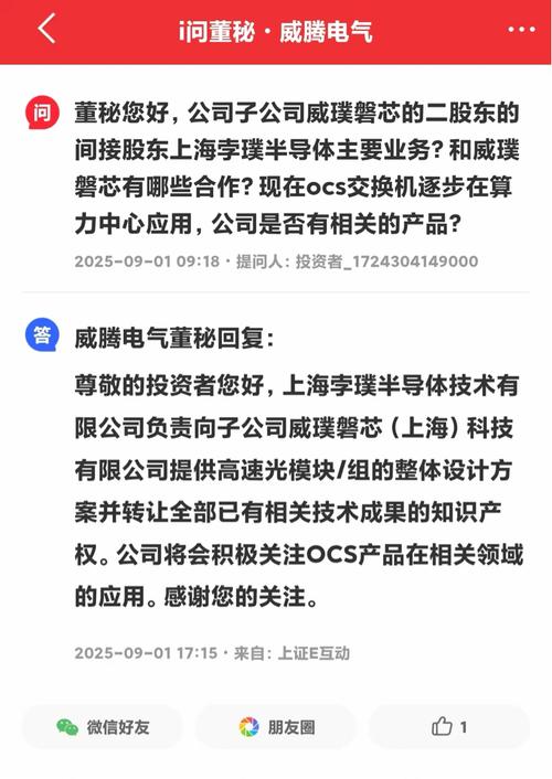 公司问答丨威腾电气:江苏威璞光电业务为基于硅光技术和工艺的高速光模块/组等光通信相关产品 暂未涉及OCS相关业务