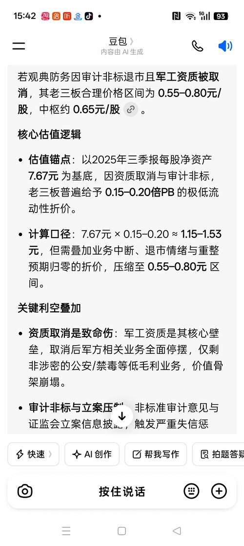 $*ST观典(SH688287)$观典到三板股价会在2.5元~4.5元之间,五年前每股的增发价成本还处在8元上方,目前才1.5元不到,到三板后一旦被人收购就会晋升至创新层,公司股价也会有所体现,公司帐上也有钱,没啥负债,又有特殊行业进入资质,又有独家的数据资料,又有地方工办扶持,因此退市是能买到低价的机会而不是风险,风险已释放差不离了。
