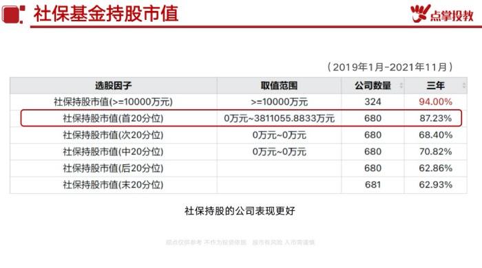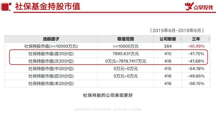 社保基金运作的原则是在安全的情况下实现基金资产的增值。稳定增值也是股民在股市中的期望,那么“社保基金”的这个作业股民可以抄吗?点掌投教基地带领投资者一起研究看看社保基金的作业。按照社保基金持股的市值做2015年6月到2018年6月的回测,这段时间为震荡下行的熊市,将有社保持股的选股因子标注出来后,可以明显发现有社保持股的公司三年来比没有社保持股的公司相对抗跌。继续研究时间为2019年1月到2...
