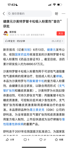$健康元(SH600380)$2024年6月,健康元发布公告称,其以化学药品4类报产的沙美特罗替卡松吸入粉雾剂获得批准,可用于可逆性气道阻塞性气道疾病的规律治疗,包括成人和儿童哮喘,成为国内首仿。这意味着,随着健康元的沙美特罗替卡松吸入粉雾剂获批上市销售,原研厂家GSK这一超级重磅产品在国内长达23年的市场独占格局遭到终结。事实上,舒利迭在国内的化合物专利在2013年便已过期,而GSK之所以能...