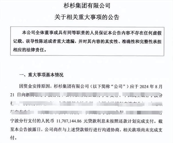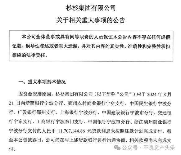 来源|不良资产头条综合8月28日,杉杉集团宣布:原定于8月21日向多家银行支付的1170.7万元的贷款利息,未能如期完成支付。服装起家,跨界新能源、商业地产、医疗、物流……拥有660亿资产的资本巨擘如今深陷债务危机。千万利息无法支付根据杉杉集团公告,此次未能偿还贷款利息,所涉及的银行包括浙商银行宁波分行、鄞州农村商业银行宁穿支行、中国民生银行宁波分行、广发银行鄞州支行、上海银行...