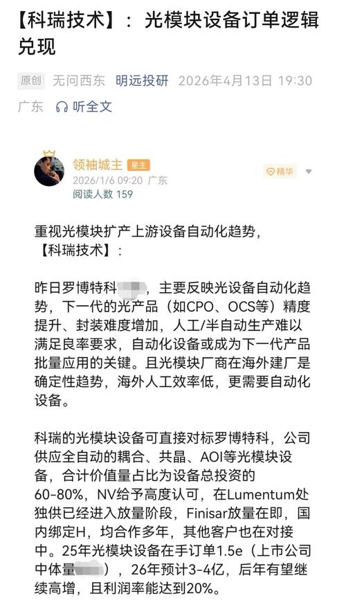 【科瑞技术】:光模块设备订单逻辑兑现