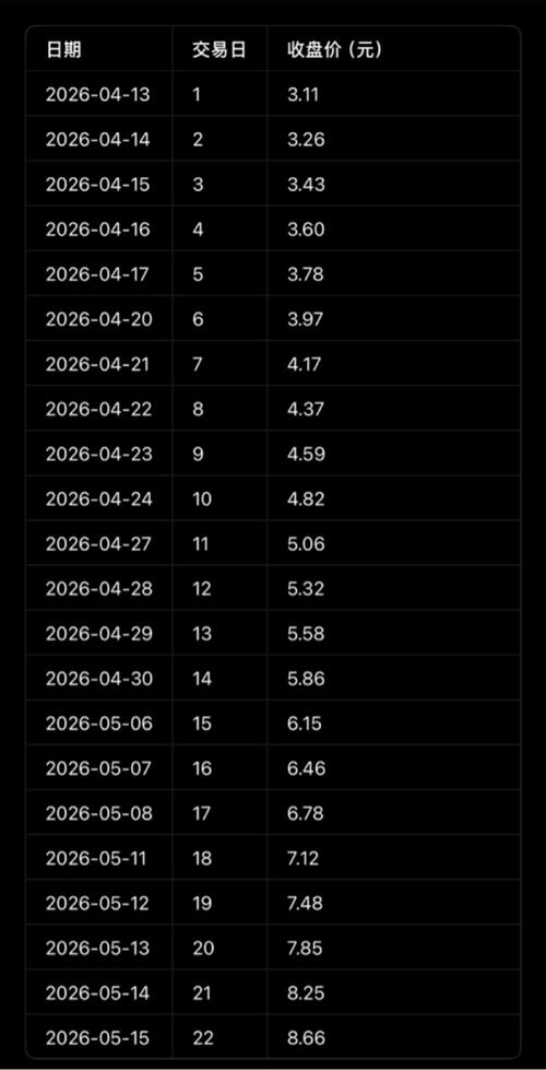 $*ST华闻(SZ000793)$如果每天都涨停,4.13~5.15的对应价格表如下:(对错全由豆包负责……)