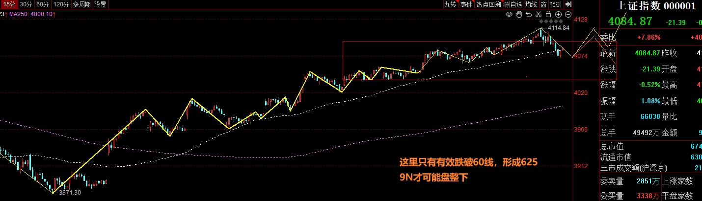 $上证指数(SH000001)$$汇绿生态(SZ001267)$$大族激光(SZ002008)$ 大盘: 今天这个大跌,很多人开始幻想下跌补缺了,其实洗盘概率更大; 我们做股票,一定要抛弃主观臆断,来看看大盘短线在干什么? 625战法讲究的是实时性,这里15F看下: 大盘一直沿着15F60线走趋势,只有有效跌破60线,才能认为开始短线震荡; 而这个震荡也只是形成15F6259N盘整而已,之后才会选...