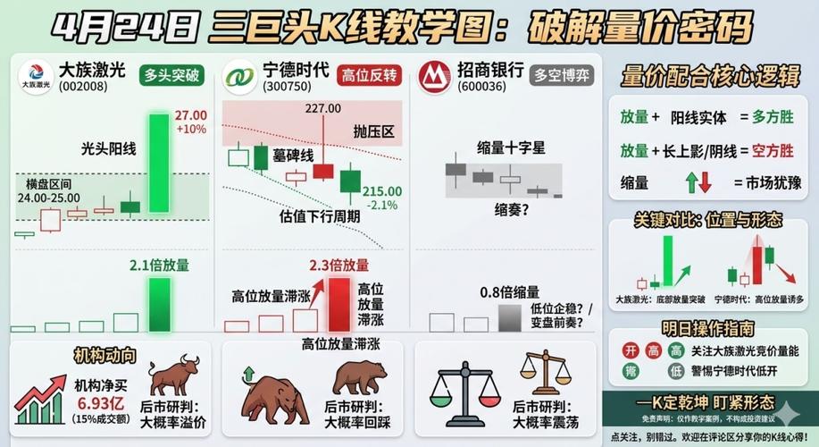 每天我只看涨跌幅前20的K线,看完就知道明天怎么走——今天$大族激光(002008)$涨停+10%,$宁德时代(300750)$冲高回落收墓碑线,$招商银行(600036)$缩量十字星。三只龙头三根K线,配合量能,明天的方向已经写在盘面上。 先说002008。今天开盘价24.50,收盘价27.00,涨幅正好10%,标准光头阳线涨停。成交量是前一天的2.1倍,放量突破近期24.00-25.00的横盘...