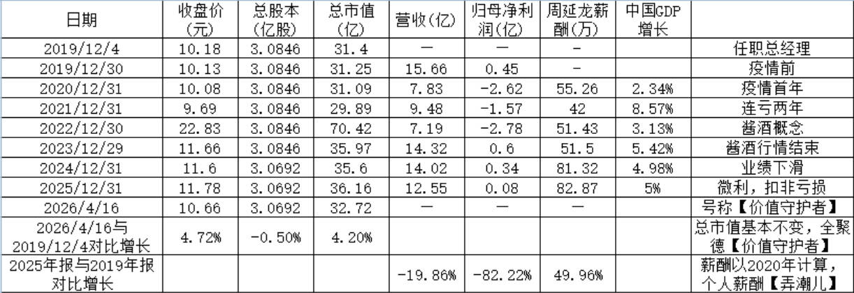 如何评价【价值守护者】的双标行为。 当面一套,号称当全聚德【价值守护者】,2019年12月4日任职时,总市值31.38亿元,2019年底31.46亿元,本【价值守护者】报道日2026年4月16日总市值32.72亿元,(32.72-31.40)/31.40=4.2%,总市值基本不变。背后一套,对自己的薪酬当【弄潮儿】。从2020年55.26万元到82.72万元,增长(82.72-55.29)/55....