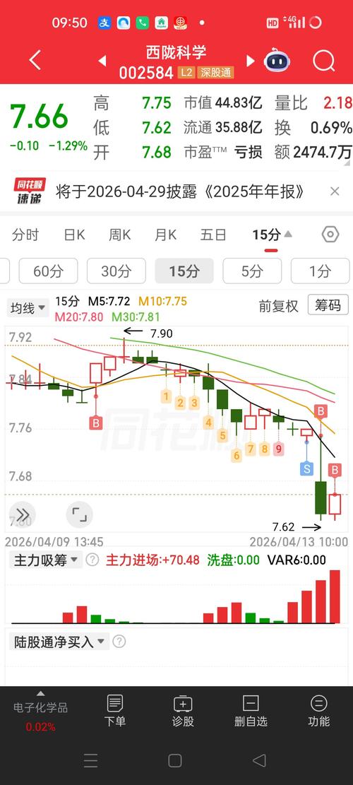 晚间话西陇科学:周五回顾与下周一展望 周五回顾 早盘7.83元开,最高冲至7.90元,最低下探7.74元,最终收盘7.76元,下跌0.51%,单日振幅2.05%,股价运行区间集中在7.74-7.90元。全天成交量13.71万手,成交额1.07亿,换手率2.93%,量比0.88,资金活跃度较前一交易日回落;委比17.70%,买盘力量稍占优势,内盘成交8.00万手,外盘成交5.71万手。所属化学试剂板...