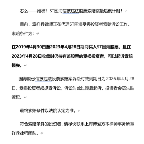 围海股份(002586)因虚假陈述收到证监会行政监管措施 具体条件为:于2024年1月31日至2024年4月30日(含当日)期间买入,并于2024年5月1日及之后卖出或持有而亏损的投资者,均可提出挽损
