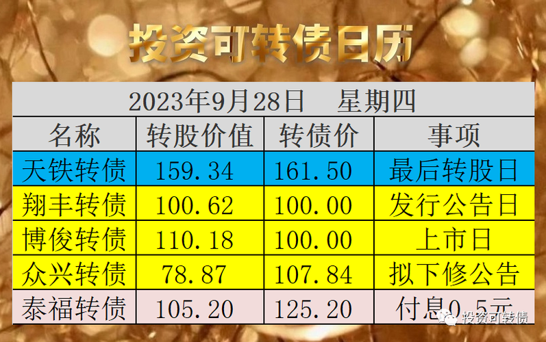 原文发送于昨日晚间。28日为天铁转债最后转股日,如果投资者忘记转股操作,将被100.84元赎回,亏损35%以上。翔丰转债宣布发行。预测中一签的概率为0.8%~2.4%。抢权配售的投资者获得收益率为4.81%。详见同日发布的《高含权锂电池负极材料8亿翔丰转债申购早知道》。28日博俊转债上市,预计是超级肉签一枚,详见后文。众兴转债满足下修条件,不出所料,在到期的压力下,提出下修议案,利好转债。详见下修...