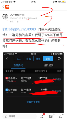 $城市转债(SZ123136)$别人可以给你10次肉,但只要让你接盘一次,就亏成原形!曾经也是你的头号铁粉,但是经历了这次。我算是寒了心,怪的不是错判,是早上你自己卖后,明明有时间可以提示下粉丝们,而且我们相信你的人那么多,个个在苦等,反而你早上自己卖后也不说,活生生多亏了5个点。这哑巴榴莲吃得真是无语!!!大家以后擦亮自己的双眼。