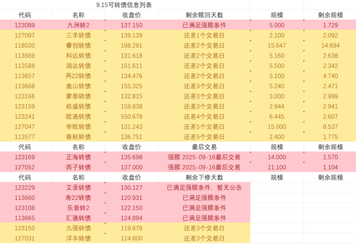 9.15可转债动态:九洲转 2等赎回、下修提示