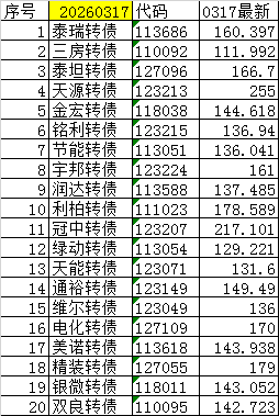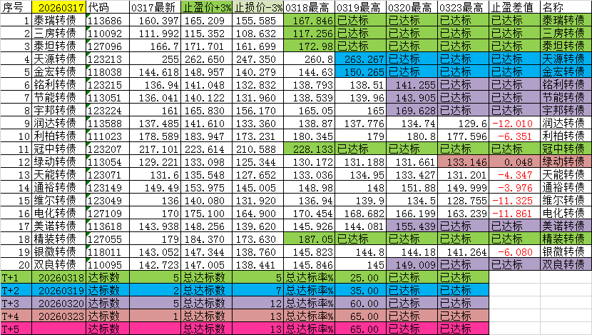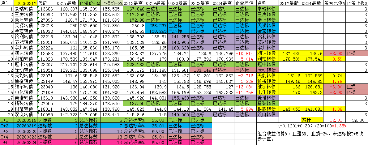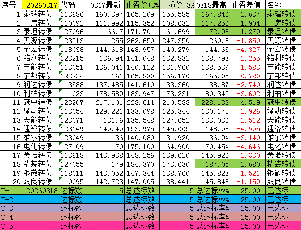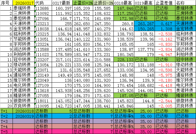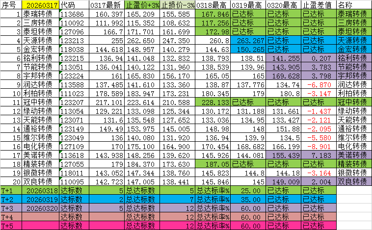 尾盘可转债(短线),每日尾盘14:40后,通过选债公式自动选择一批可转债标的,一周内大于3%收益的概率(五个交易日,以最高价计算)。盘中采用其他方式公布,本平台栏目不便及时发帖。为了计算方便,盘后以当日收盘价作为计算初始数据。 #社区牛人计划##特朗普称美对伊军事行动本周不会结束##霍尔木兹海峡危机升级,阿曼湾油轮遇袭# $荣23转债(SH113676)$...