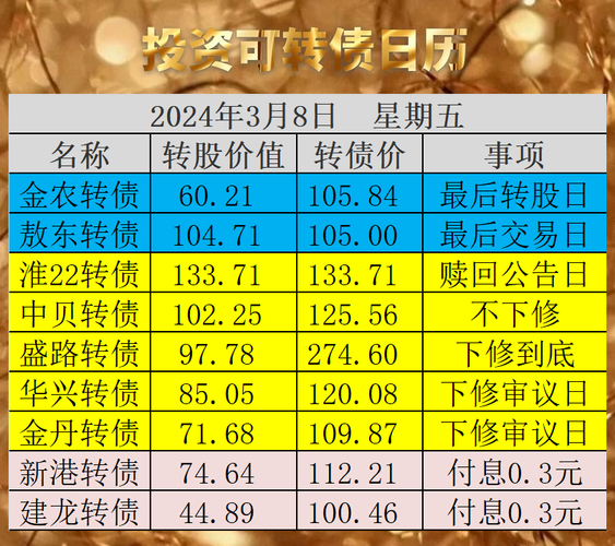 原文发送于昨日晚间。8日为金农转债最后转股日,当前转股价值仅为60元,税前赎回价为106元,税后赎回价为105.6元,持有等赎回划算。8日为敖东转债最后交易日,当前转股价值为104.7元,税前赎回价为105元,税后赎回价为104.6元,当前价为105元,激进的投资者可以赌3月13日最后转股日之前的正股上涨,保守的投资者当前价105卖出稳妥。淮22转债满足赎回条件,公司宣布强赎,有一定的赎回压力,详...