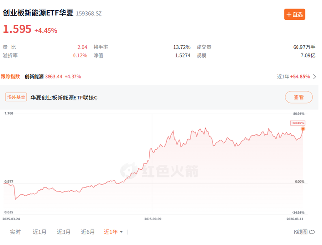 今日,A股市场成长风格再度领跑,资金明显涌向以新能源为代表的高景气赛道。截至上午收盘,创业板新能源ETF华夏(159368)表现抢眼,上涨4.45%!这并非一日之功,而是多重积极因素共振、行业趋势向好的集中体现。对于普通投资者而言,这或许是一个值得关注的信号。 数据来源:红色火箭小程序,截止2026.3.11盘中 近期,宏观环境、政策支撑和行业基本面均推动新能源板块走强。 随着地缘冲突出现缓和迹象...