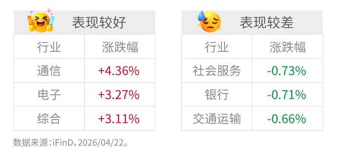 4月22日,A股市场低开高走,算力硬件方向全线拉升。国务院日前印发《关于推进服务业扩能提质的意见》,围绕全链条补强生产业薄弱环节、提升生活业重点领域发展能级、加快服务业数智化、标准化、融合化、国际化进程等方面,提出20条具体举措,旨在系统性提升服务业质量与效能,为构建现代化产业体系和推动高质量发展提供有力支撑。 市场回顾: 4月22日,A股三大指数集体上涨,沪指收复4100点,创业板指...
