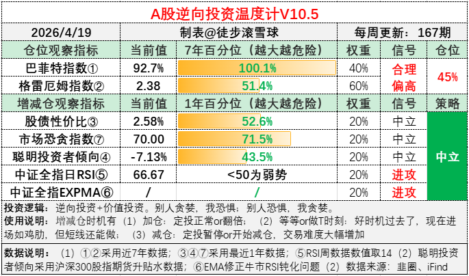 逆向温度计表格,是我结合多机构和平台的经验,自制的一款量化仓位和择时工具,跟踪3年多以来,整体还是很靠谱的。之前内测阶段发的少多从数据,后续每周会对外公布一次。 根据仓位观察指标看,当前合理仓位在45%左右(实际上可以打八折)。 根据增减仓观察指标,当前策略中立,可以小幅度定投。结合市场景气板块和强势板块看,重点是创业板、AI和贵金属。 PS:投资有风险,决策需谨慎。任何决策都需要建立在独立思考的...