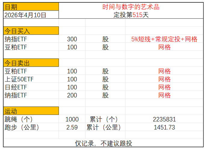 运动与投资第515天 2026年4月10日 今日定投: 纳指ETF买入300股 豆粕ETF买入100股 上证50ETF卖出100股 日经ETF卖出100股 纳指ETF卖出200股 豆粕ETF卖出100股 跳绳:1000个,累计跳绳:2235831个 慢跑:2.59公里,累计慢跑:1451.73公里 $纳指ETF国泰(SH513100)$$纳指ETF广发(SZ159941)$$纳斯达克100(QQZS|NDX100)$...