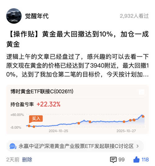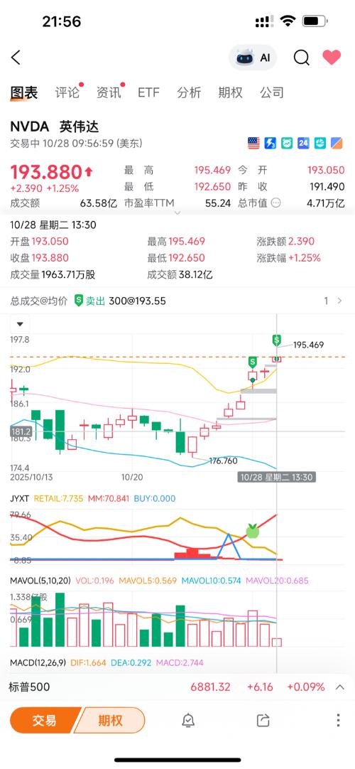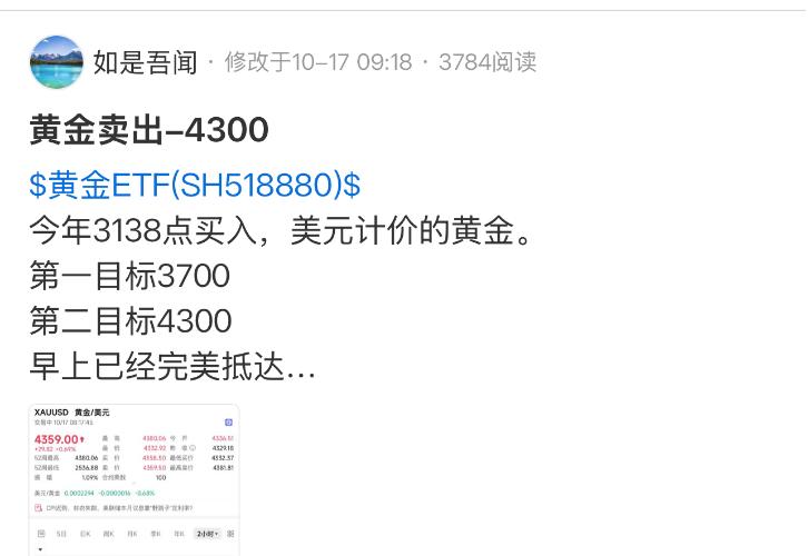 如是吾闻 更新于 10-31 19:51 4496次浏览 1028 坚定卖出-利润256w $纳指ETF(SZ159941)$ 纳指10500发帖买入 当前23729 开盘连续跳涨 且纳指创历史新高 在我的交易系统中 正是卖出的时机 具体来说 持仓英伟达 75刀买入 本次193.6刀卖出 今年6个投资方向 三个交易账户合计盈利256w Q4最重要的是守住利润 黄金4300点清仓当前2周已经下跌了400个点 $黄金ETF(SH518880)$ 还会买回 大A创业板,目前认为B浪反弹高点区域... 3626