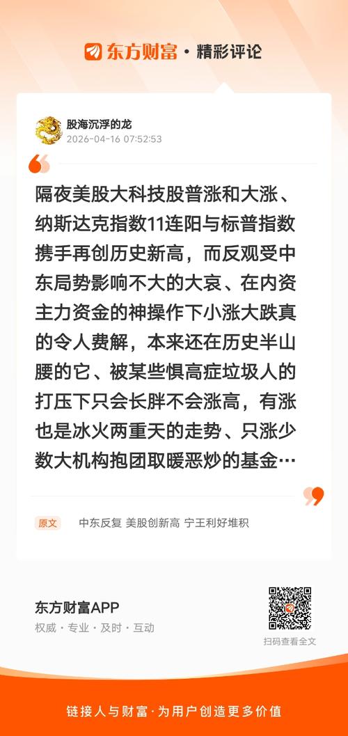 隔夜美股大科技股普涨和大涨、纳斯达克指数11连阳与标普指数携手再创历史新高,而反观受中东局势影响不大的大哀、在内资主力资金的神操作下小涨大跌真的令人费解,本来还在历史半山腰的它、被某些惧高症垃圾人的打压下只会长胖不会涨高,有涨也是冰火两重天的走势、只涨少数大机构抱团取暖恶炒的基金龙头股,大部分普通投资者持有的股票则跟跌不跟涨、因此屡屡都是哀鸿遍野一地鸡毛,特别是最近在中东局势变化无常的影响下、这种...
