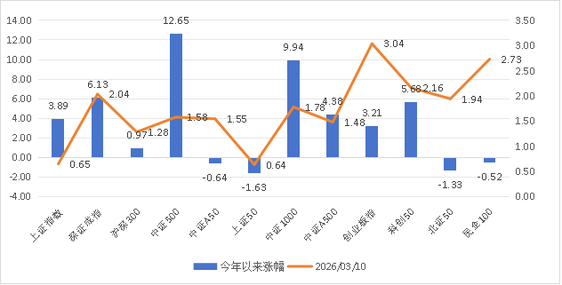 一、市场温度计 市场温度计介绍:由弘毅远方基金自研,用于判断股票市场情绪,区间为0-100;数据越高,市场温度越高;数据越低,市场温度越低。 风险提示:仅用于反映市场情绪,不作为买卖依据,仅供参考。 市场温度计(短期):44;市场温度计(中长期):53。 市场温度:进攻。 数据来源:wind弘毅远方基金整理;数据区间:20240902-20260310 二、主要指数与行业情况 数据来源:choic...