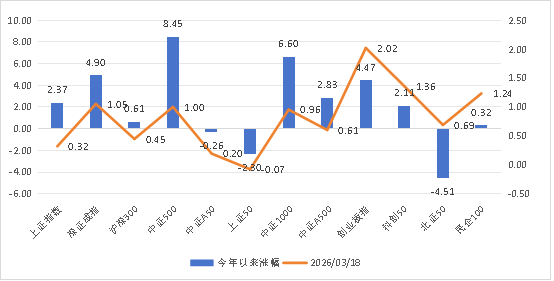 一、市场温度计 市场温度计介绍:由弘毅远方基金自研,用于判断股票市场情绪,区间为0-100;数据越高,市场温度越高;数据越低,市场温度越低。 风险提示:仅用于反映市场情绪,不作为买卖依据,仅供参考。 市场温度计(短期):21;市场温度计(中长期):44。 市场温度:进攻。 数据来源:wind弘毅远方基金整理;数据区间:20240902-20260318 二、主要指数与行业情况 数据来源:choic...