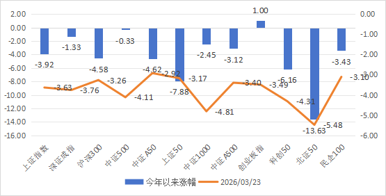 一、市场温度计 市场温度计介绍:由弘毅远方基金自研,用于判断股票市场情绪,区间为0-100;数据越高,市场温度越高;数据越低,市场温度越低。 风险提示:仅用于反映市场情绪,不作为买卖依据,仅供参考。 市场温度计(短期):0;市场温度计(中长期):28。 市场温度:进攻。 数据来源:wind弘毅远方基金整理;数据区间:20240902-20260323 二、主要指数与行业情况 数据来源:choice...