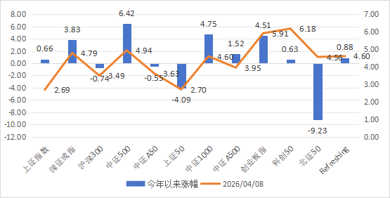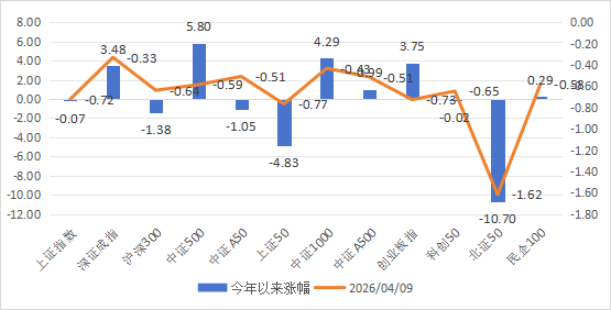 市场温度计介绍:由弘毅远方基金自研,用于判断股票市场情绪,区间为0-100;数据越高,市场温度越高;数据越低,市场温度越低。 风险提示:仅用于反映市场情绪,不作为买卖依据,仅供参考。 市场温度计(短期):24;市场温度计(中长期):40。 市场温度:进攻。 数据来源:wind弘毅远方基金整理;数据区间:20240902-20260409 二、主要指数与行业情况 数据来源:choice;数据日期:2...