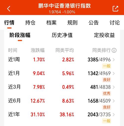 我的账户今天又绿了,还好有$鹏华香港银行指数(LOF)C$(010365)撑着。这种紧密跟踪香港银行投资指数的产品,本质是赚取板块平均收益,避免了个股选择失误。在天天基金这样的平台,买卖都很便捷。当市场缺乏热点、资金寻求避风港时,低估值且具备高分红能力的港股银行股往往是资金的首选。遇事不决香港银行,我已经把它当作组合的标配了。#以军战机轰炸黎巴嫩!美伊停火生变?#