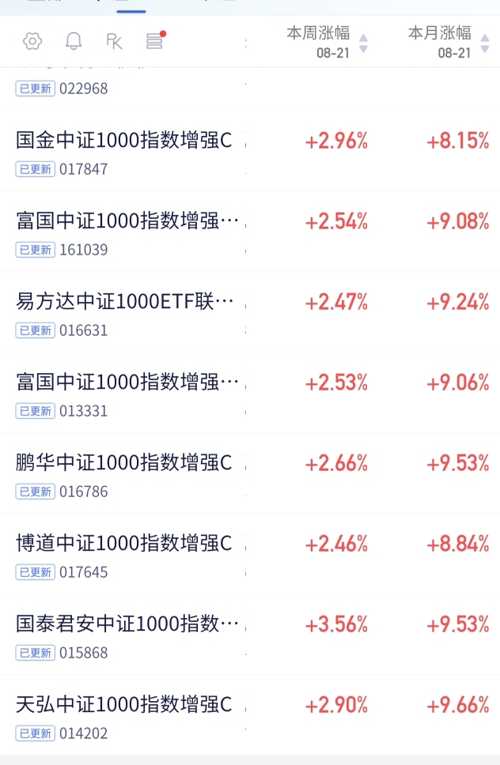 $国泰君安中证1000指数增强C$紧密跟踪指数,量化策略精准出击,力求超越指数收益。一周就涨了3.56%,成长潜力大,值得关注。$国金中证1000指数增强C$一周涨2.96%,还是可以的 $富国中证1000指数增强(LOF)A$一周涨2.54%,继续加油