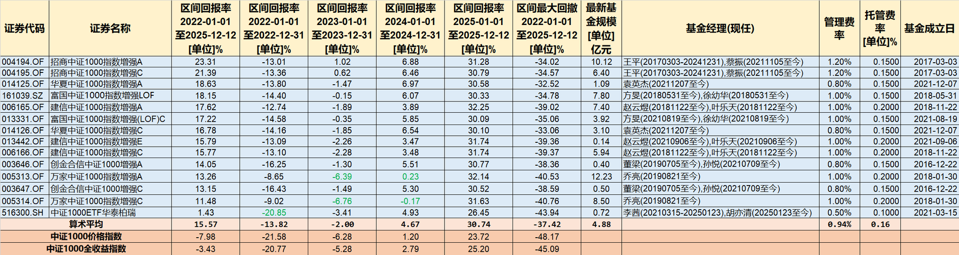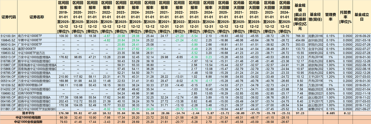此前我们连续整理了年年跑赢标的指数的沪深300、创业板和中证500指数基金,今天继续梳理中证1000指数基金。 中证1000指数,作为A股核心宽基指数中至关重要的小盘股代表,精准地捕捉了剔除中证800指数成分股后,规模偏小但流动性较好的1000只股票的整体表现,是投资者进行小盘布局的重要工具,同时也是量化指增重要的大本营。 截至2025年12月12日,跟踪中证1000指数的基金一共110只,其中一...