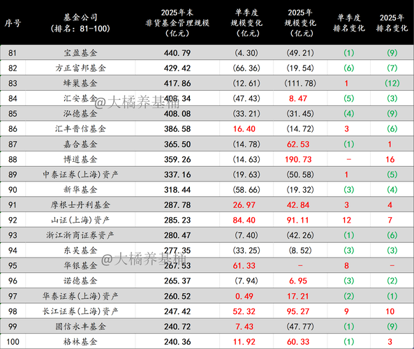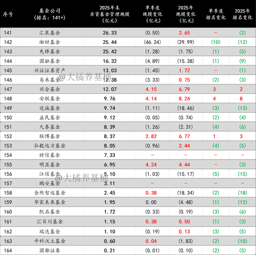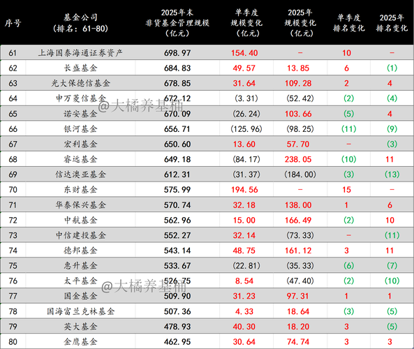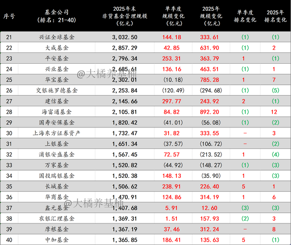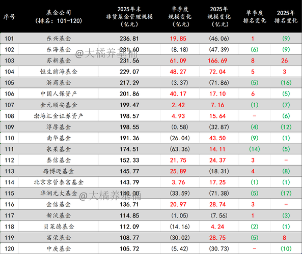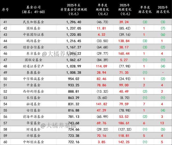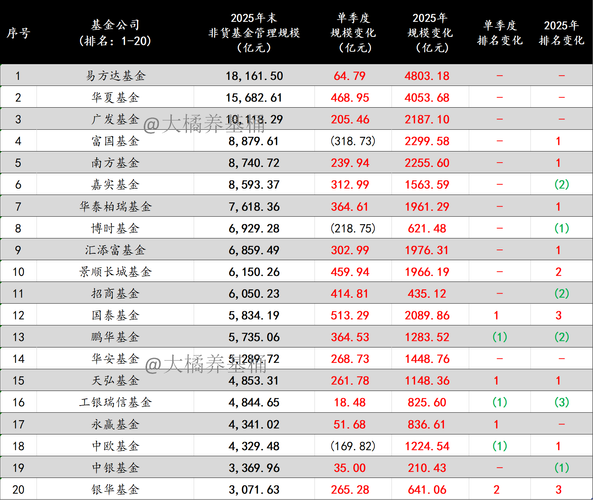 聊几句。 1、公募行业头部效应依然明显,强者恒强的格局让人生畏,全年非货管理规模涨幅超千亿的基金公司多达14家。 2、2025Q4权益市场震荡,结构化行情凸显,不少基金公司获得涨幅加持下,单季度规模增长超200亿。 3、含货币的话,已有10家规模万亿的基金公司,并且与后方拉开了4000亿以上的差距。 4、非货规模方面,第三家非货突破万亿的基金公司正式诞生。非货管理规模8000亿以上的基金公司达6家...