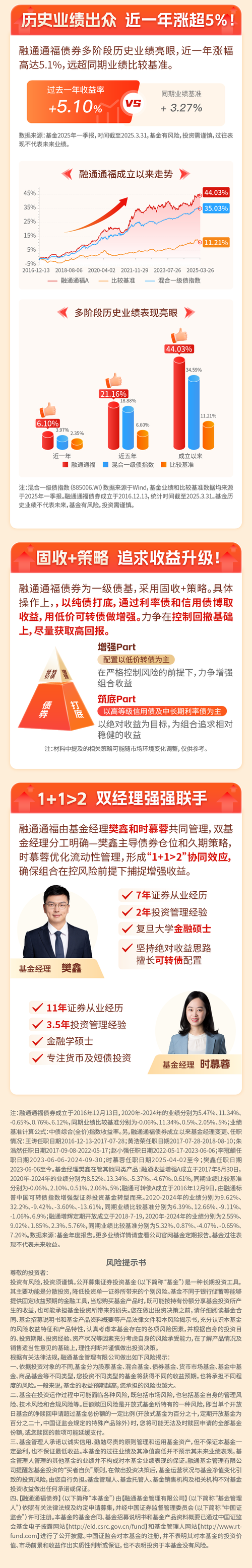 融通通福债券为一级债基,采用固收+策略,纯债打底,转债增厚,多阶段业绩亮眼,双基金经理保驾护航! $融通通福债券(LOF)A(OTCFUND|161626)$ $融通通福债券(LOF)C(OTCFUND|161627)$ $融通通福债券(LOF)D(OTCFUND|021434)$