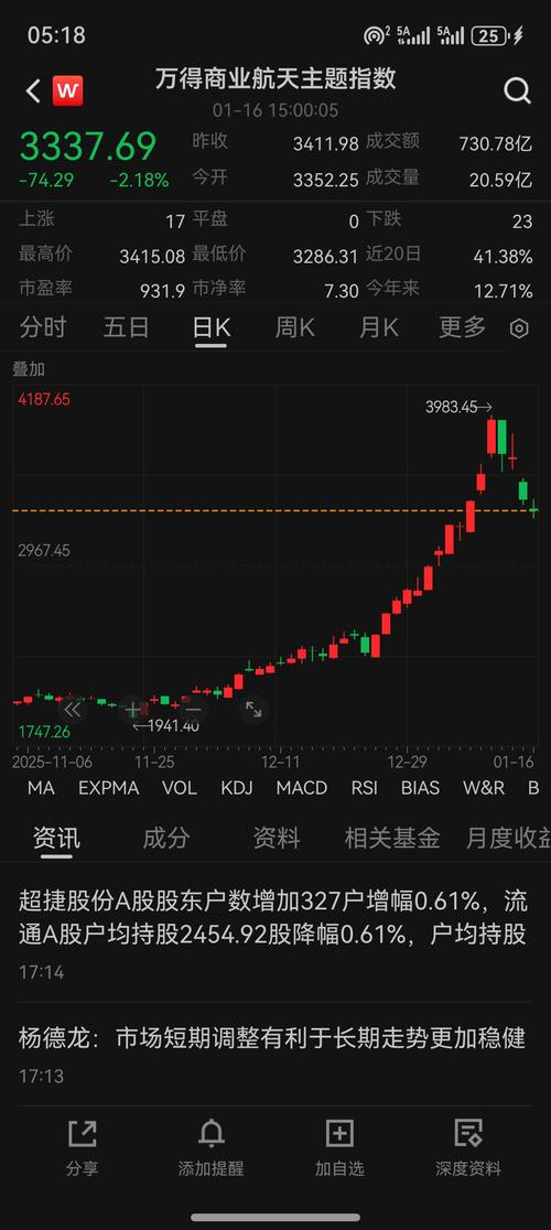 这两天的行情有些乏味,没前几天的激情了。今天A股中位数涨幅-0.30%,2371家上涨,2973只待涨。 交易活跃度也有些回落,从前天的3.99万亿回落到3.06万亿元,日成交额少了接近1万亿。当然了,即使是回落后的成交额,在历史上也是非常高的存在。 现在的阶段,就是牛市中的盘整阶段。元旦以来,大家关注度最高的商业航天,已经连续调整4天了,从最高点已经下跌了16.21%: 不过即使如此,从年初以来...