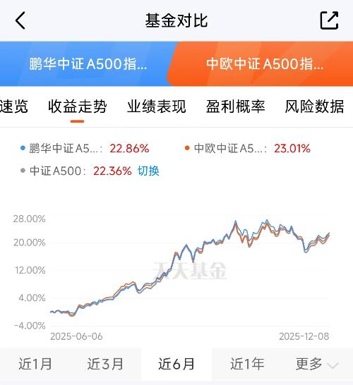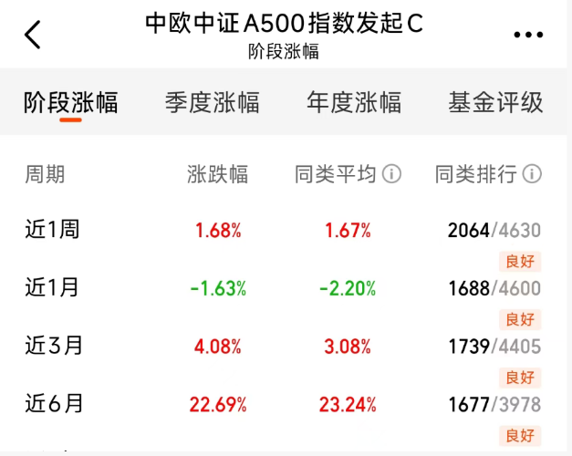 这个$中欧中证A500指数发起C$(022433)是我今天的选择。我比较过很多中证A500的指数基金,发现中欧这个在收益方面确实有优势。比如从近六个月的维度看,它取得了21.25%的增长。你可能会看到一些同期运作的中证A500基金,像永赢中证500指数增强(023305)收益差不多,但波动就更大。这就是靠谱增强策略带来的区别,是实实在在的超额收益和持有体验的改善。当前市场环境下,选择覆盖面广的中证...