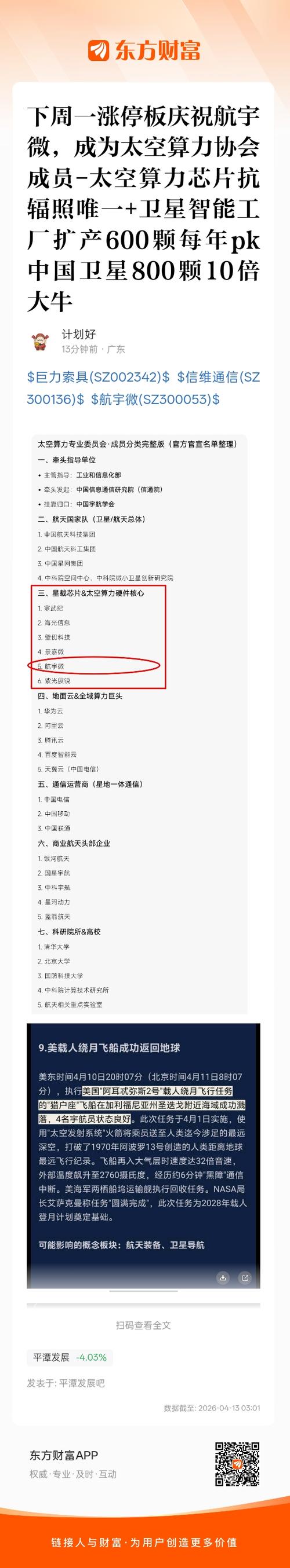 30倍空间,3千多亿市直的寒武纪还在太空测试,没有量产(量产需要测试5年),跟不上20万颗卫星组网,航宇微独享太空算力AI芯片标配$乾照光电(SZ300102)$$臻镭科技(SH688270)$$光迅科技(SZ002281)$