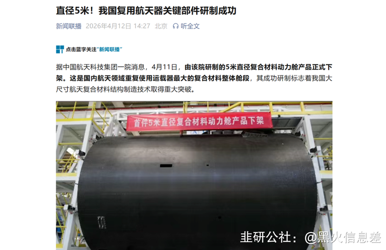 $乾照光电(SZ300102)$ 我国复用航天器关键部件研制成功 【我国复用航天器关键部件研制成功】财联社4月12日电,记者从中国航天科技集团一院获悉,4月11日,由该院研制的5米直径复合材料动力舱产品正式下架。这是国内航天领域重复使用运载器最大的复合材料整体舱段,其成功研制标志着我国大尺寸航天复合材料结构制造技术取得重大突破。(科技日报)