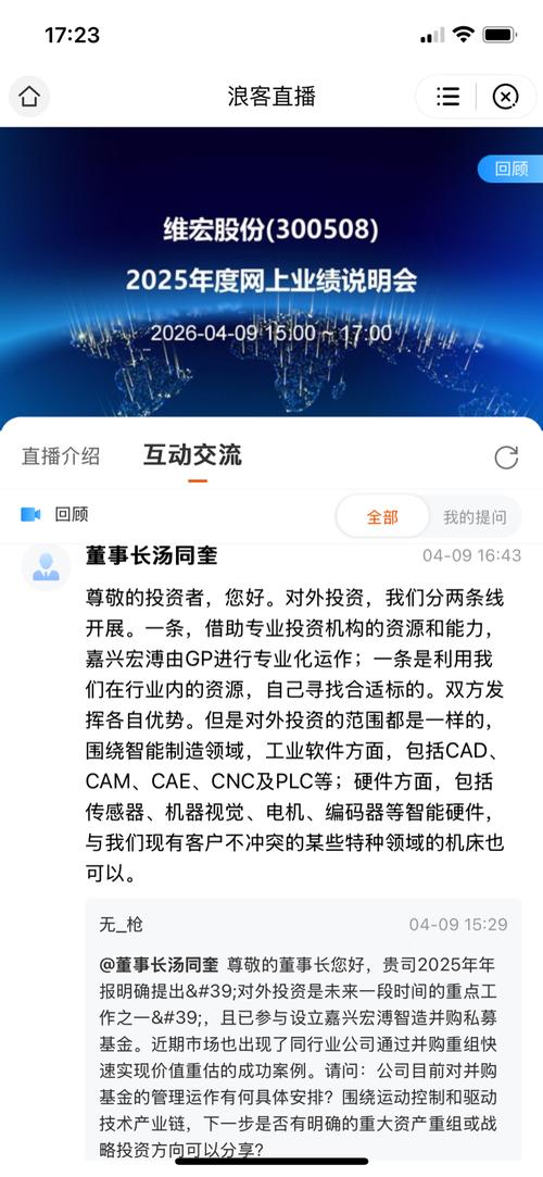 4月9日,维宏股份举办2025年度网上业绩说明会。公司董事长汤同奎、董事会秘书刘明洲、财务总监杜治付、独立董事王霞出席本次业绩说明会。 就投资者关注的并购基金运作及投资方向的问题,董事长汤同奎表示:对外投资分两条线开展,一方面借助专业投资机构资源,嘉兴宏溥智造并购基金由GP进行专业化运作;另一方面依托公司行业资源自主寻找合适标的,双方发挥各自优势。投资范围均围绕智能制造领域,工业软件方向涵盖CAD...