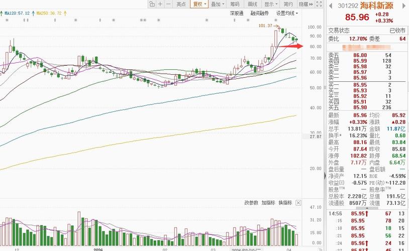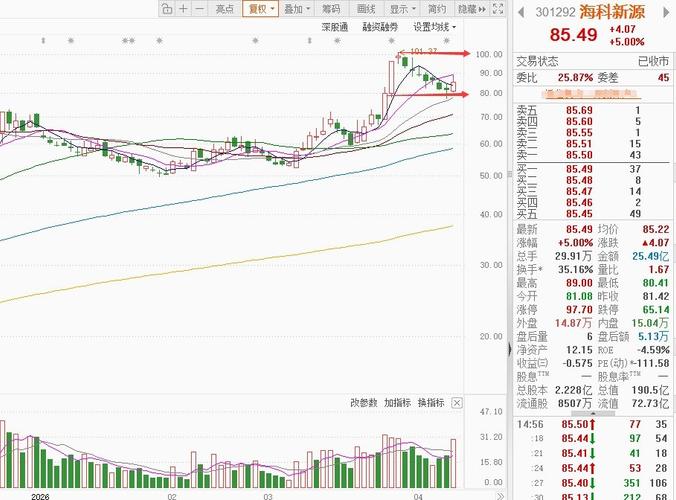 个股观察:(个人观点,不构成任何投资建议) 海科新源 公司是电解液溶剂全球龙头,VC产能逐步释放,深度受益于锂电+储能行业高景气周期,业绩反转确定性较强,中长期基本面具备支撑。 海科新源上周五强势反弹,开盘上行并一度冲高,尾盘小幅回落仍收红。成交量与换手率大幅放大,资金分歧显著,大资金兑现但承接有力,呈现高位震荡走强。短线情绪回升,后续或仍有震荡,重点关注能否在整数关口企稳。 今天我重点观察5均是...