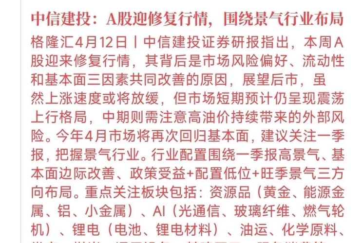 中信建投认为短期内股市会震荡上行,大方向虽然是向上的,但上涨的速度会变缓。中期还是要注意原油价格带来的风险。预计4月会回归基本面 板块上面配置有政策的行业,低估值底位板块,旺季景气度板块。 其实现在短线上面还是被外围消息面影响,短期内甚至4月整月都会被原油价格支配,目前看A股虽然机会和危险并存,但是容错率还是太低,更多的是注意风险。 板块上面目前还是涨价概念和资源股比较保险,别的板块目前全是风险,...