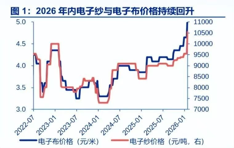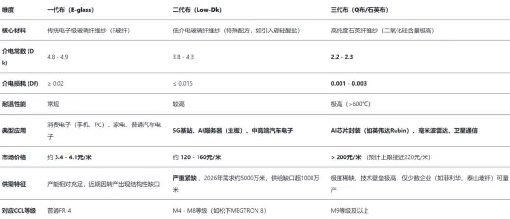 AI算力材料升级逻辑 NvidiaRubin架构推动M9级PCB需求,高频高速材料(低介电玻纤、石英布)成为算力硬件瓶颈环节,技术壁垒决定议价权。 电子纱涨价传导逻辑 电子纱G75主流报价11,800-12,500元/吨,7628电子布5.9-6.5元/米,新价落实较好,排除"有价无市"风险。 国产替代加速逻辑 全球高端电子布日企(日东纺、旭化成)占70%份额,国内厂商(菲利华、国际复材、山东玻纤...