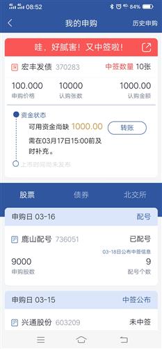$宏丰发债(SZ370283)$中了一签