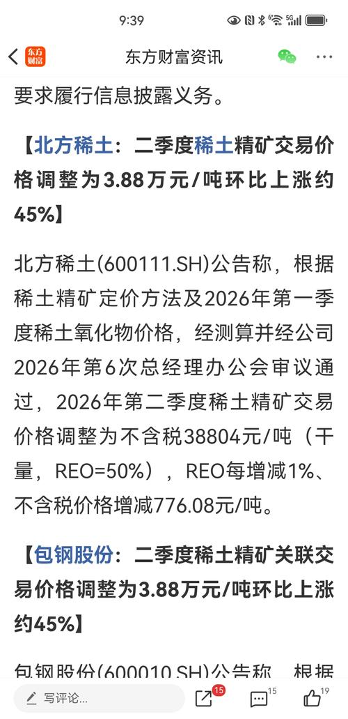 $域潇3(SZ400122)$4月10日晚,包钢股份、北方稀土公告:2026年二季度稀土精矿价调至38804元/吨,环比涨约45%,为连续第7季上调。